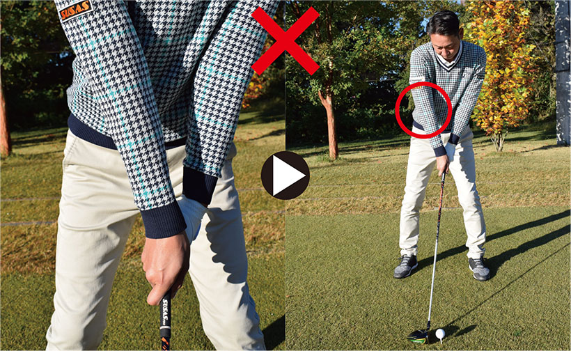 クラブを真っすぐ立てたところから下ろしていくと、両ワキが締まってこれ以上下ろせないというポジションが必ずあります。