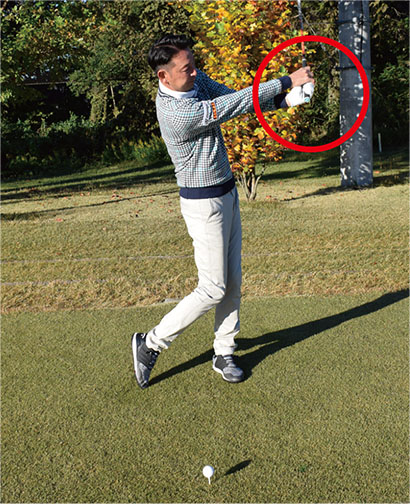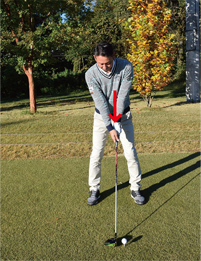 2.両ヒジをすっと伸ばしてクラブを真っすぐ下ろす。そうすると両ワキが締まって、腕が止まるポジションがある。手首が自然に親指側に軽く曲がり、腕とクラブに角度が形成される