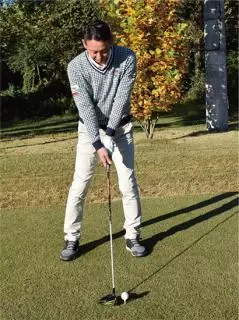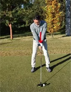 左胸の前でクラブを真っすぐ立ててからアドレスを作ろう