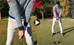 逆に左手を深くかぶせて、右手を浅く握ると右肩が下がりすぎた構えとなります。この場合は極端なインサイドアウトの軌道となり、フェースが開いて右にプッシュアウトしてしまいます。