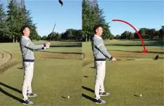 そのままスイングするとアウトサイドインの軌道でボールをとらえることになり、フェースが開けばスライス、フェースがかぶるとヒッカケが生じます。
