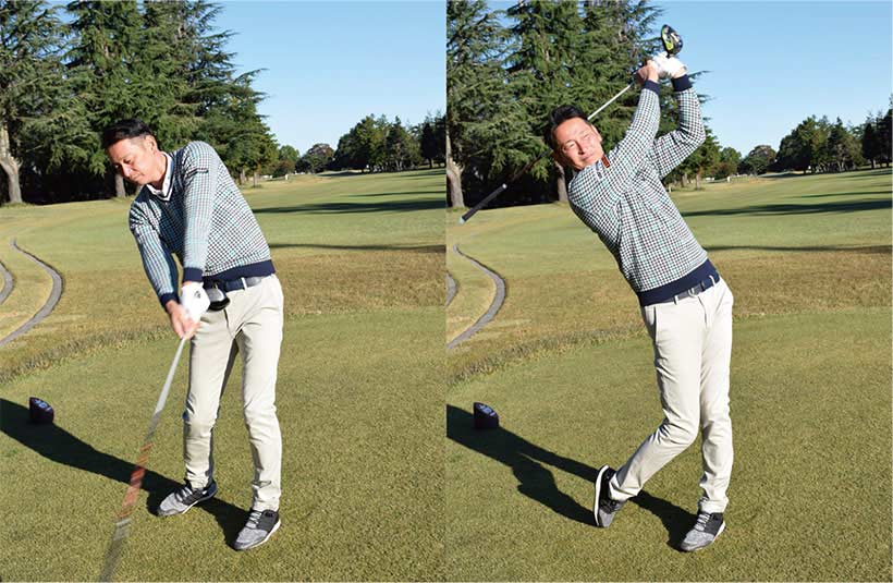 その素振りの後で、本番さながらのドライバーショットを打ちましょう。重いものを振るときのように体を大きく使って、軽いものを思い切り速く振るときのように瞬間的に振り切ります。