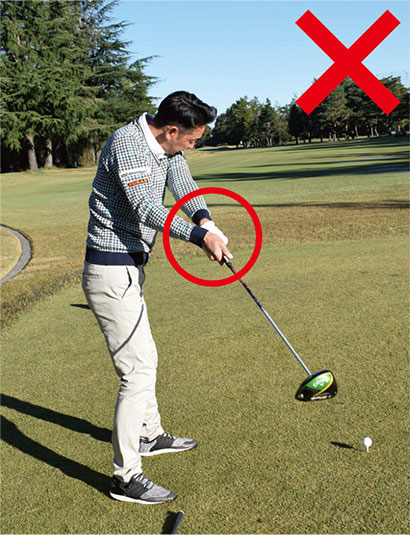 飛ばそうとして力むとダウンスイングで手首が早くほどけて、クラブがアウトサイドから下りてしまいます。