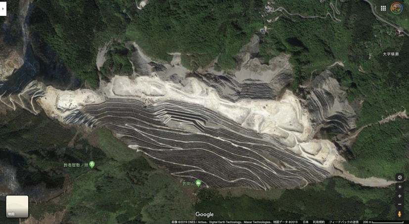 採掘の証拠に、白っぽく、遠くからでも段段になっている痛々しい採掘跡が見てとれます。上の写真はキングダムGCからではなく、以前撮影した別の角度からの姿。次のは同じ日のゴルフ場からです。
