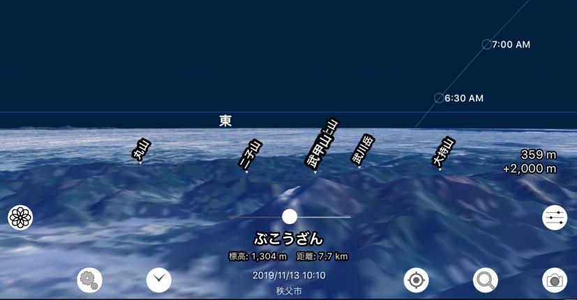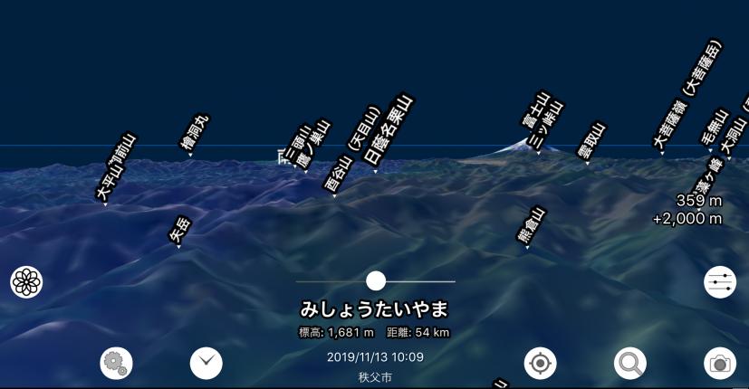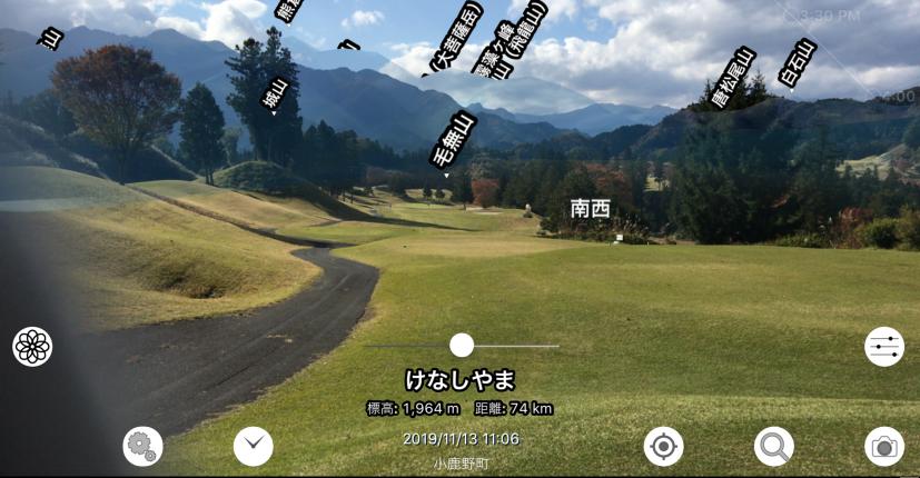 アプリの使い方は簡単。起動して、知りたい山並みに画面を向けるだけ。あちゃこちゃ見てたら、なんと、