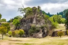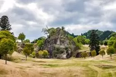 さて、お待ちかねの『とんがり君』。OUTコースはとんがりパラダイスです。あ、そもそも、とんがり君というのは、7番PAR4のグリーン奥にどっしり構える巨岩山のことです。それを勝手に、しかしありったけの愛を込めてとんがり君って呼んでるだけです。だって、ゴルフ場多しといえども、巨大な岩山に向かって打っていくホールなんて、アメリカのユタ州にはいっぱいありそうだけど、日本ではなかなかお目にかかれないよ。まさにスペクタクル。なんでもこのゴルフ場を作るときに爆破してこんぐらいの大きさになったとか。詳しい経緯はわからないけど、ぜんぶ粉々にならなくてほんとうによかった。