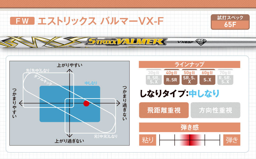 ビッグバットで手元側の剛性を高めた先しなりです。切り返しでシャフトに負荷をかけてもヘッドコントロールが容易。インパクトゾーンで自然と球つかまえて上げるように動きます。適度な粘りでタイミングも取りやすい。