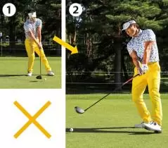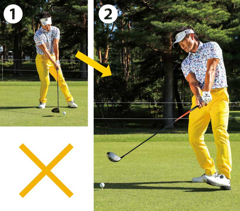 ❶ アウトからクラブが下り右足に体重が残ってカット打ち。ラウンドでこれを直すのは難しい。