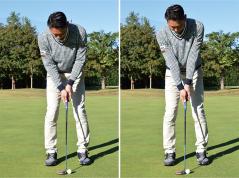 パターの長さによっては、両腕を自然に伸ばしても両ヒジを軽く曲げてもOKです。ポイントは両手を少し浮かせてハンドアップ気味に構えること。