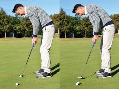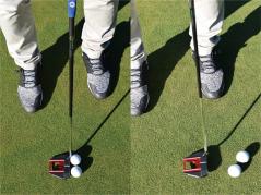 効果の高い練習法をもう一つ。ボールを縦に2個並べて構え、2個のボールを同時に打ちましょう。インパクトでフェースが正しくスクエアに戻れば、2個のボールが同じ方向に転がっていきます。