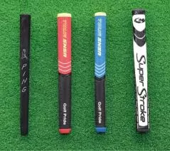 パターグリップには様々なタイプがあるが、大きく分けると、写真左から細くて軽いタイプ。太くて重いタイプ。細くて重いタイプ。太くて軽いタイプの4つに分けることができる。ここでいう軽いタイプはおおよそ60g台までを指し、重いタイプは110gを超すものも存在する。