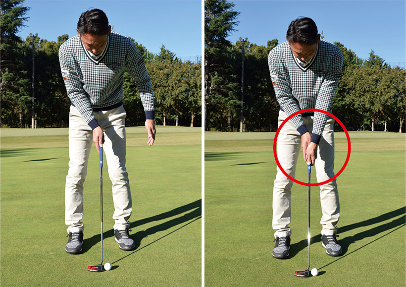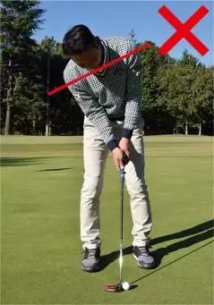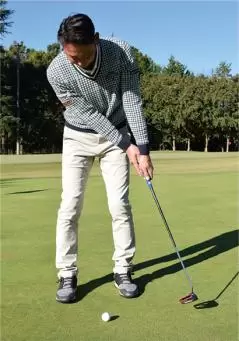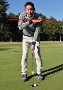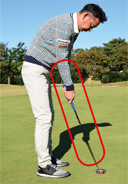 ショットの場合はコッキングを使ってクラブヘッドを走らせる必要があるので、両手の小指側から握り、手首に角度をつけて構えますが、パターでは手首の角度をつけませんからヒジから先とシャフトが一直線に見えるような形となります。