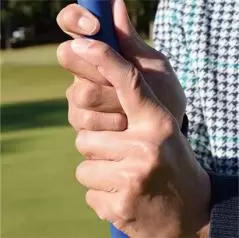 親指をグリップの真上に乗せれば、あとはどんな形でも構いません。ショットと同じようにオーバーラッピンググリップやインターロッキンググリップに握る人もいます。