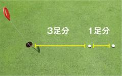 カップから1メートル前後の位置にボールをセットするには、「足」を基準にするのが簡単でおすすめです。カップ側から3足目のつま先位置(約90センチ)と、4足目のつま先位置(約120センチ)にボールをセットします。