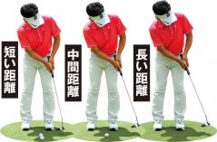 右足を基準とした3つの振り幅で、各3球ずつ打つ。3球の平均値を把握することで、本番のパッティングでも自信を持って距離を打ち分けられる。
