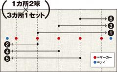上図のように約2メートル間隔の位置にマーカーを置き、各地点から右左の目標に向かって1球ずつ(計2球)打ちます。各地点から左右交互の目標に向かって打つことで、様々なラインや距離への対応力がアップします。