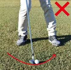 ダウンブローに打つといっても、何でもかんでも上から鋭角に打ち込めばいいというものでもありません。ダウンスイングでクラブを急角度で振り下ろしてしまうとフェースの刃が芝に刺さってフォロースルーが取れなくなってしまいます。
