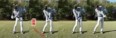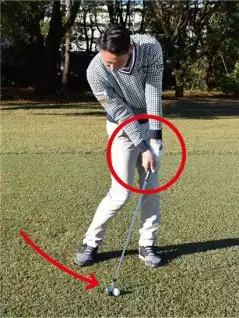 すくい打ちになるとダウンスイングからインパクトにかけて体重が左足に移動せず、右足体重のままでインパクトを迎えてしまいます。スイング軌道の最下点がボールよりも手前側となり、結果はダフリです。