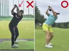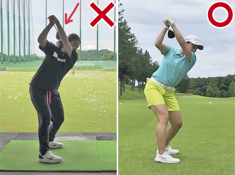トップを後方からみたときに、ヘッドの位置が右腕と左腕の間の三角ゾーンに入っているのが理想なのですが、この日は大きく垂れ下がっていました。これだと、ダウンスイングに入る切り返しの際に余計な動作が追加されてしまうので、どうしてもミート率が下がりやすのです。パターに関しては、打ち方が悪いわけではなく、距離感が合わず、すべてショートしていたのが原因でした。