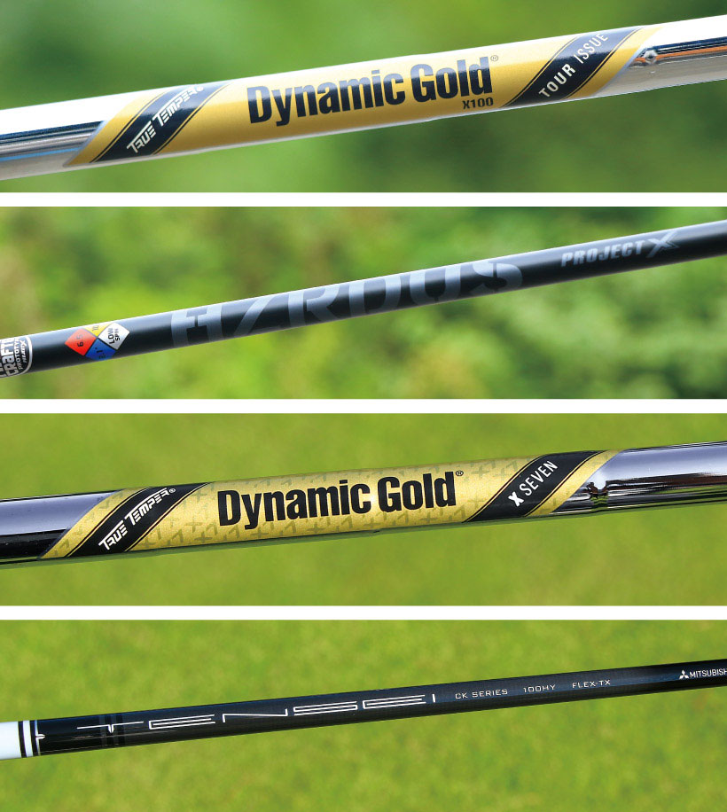 写真上からタイガー、マキロイ、デイ、モリカワのNEWP790に装着されたシャフト。デイのダイナミック・ゴールドのフレックスは「XSEVEN」という、以前タイガーが使っていたX500相当の硬さと重さがある。