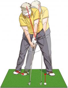 腕を伸ばし、右足を広げて立ったら上体を右傾させつつヘソを左に向ける。スタンスはややクローズド。ボール位置は左カカト延長線上。