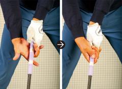 ややフックの左手に対し思いきり下から右手をフィンガーで握る。グリッププレッシャーは比較的ゆるい。