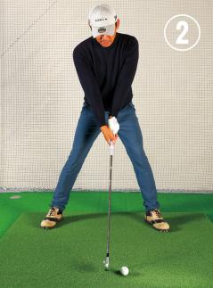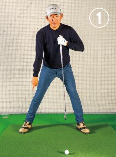 ②両腕を伸ばしワキも空けてOK。インパクトのイメージで構える。