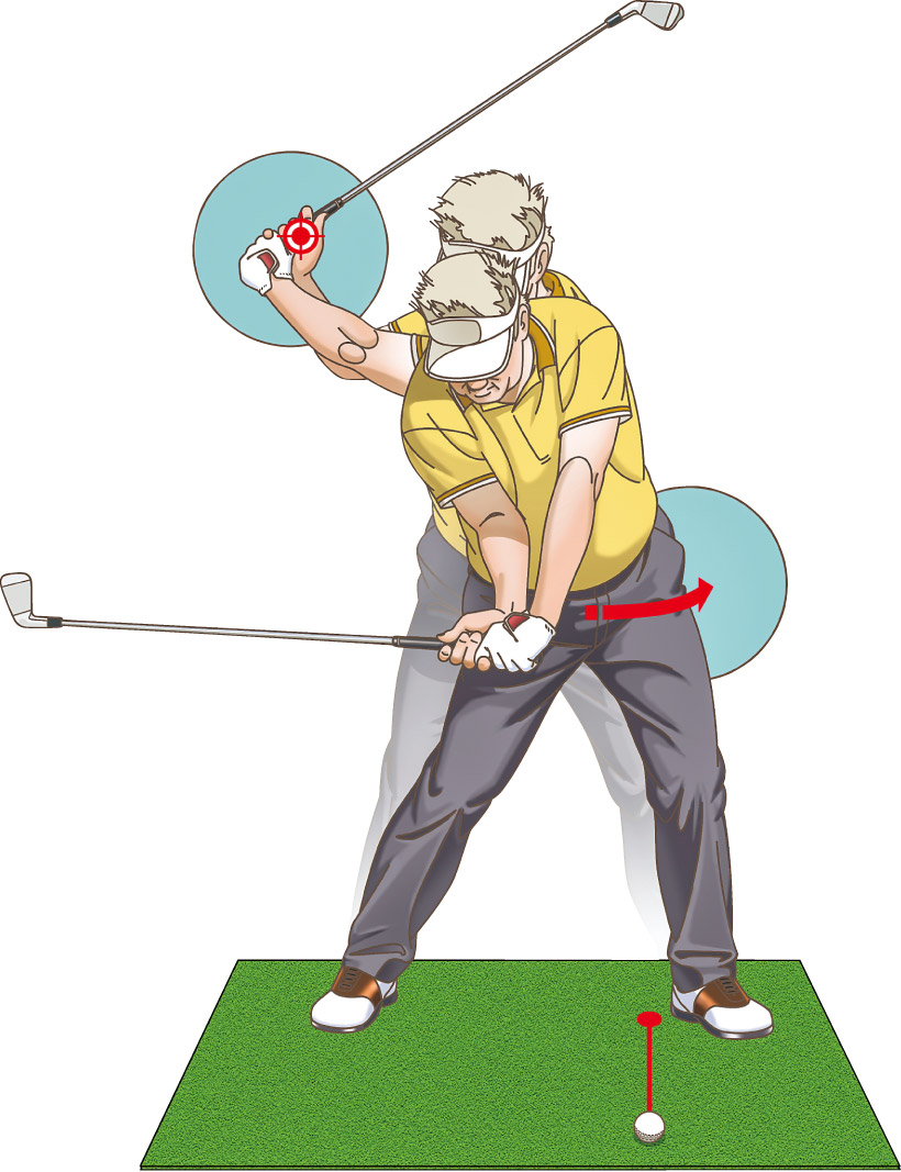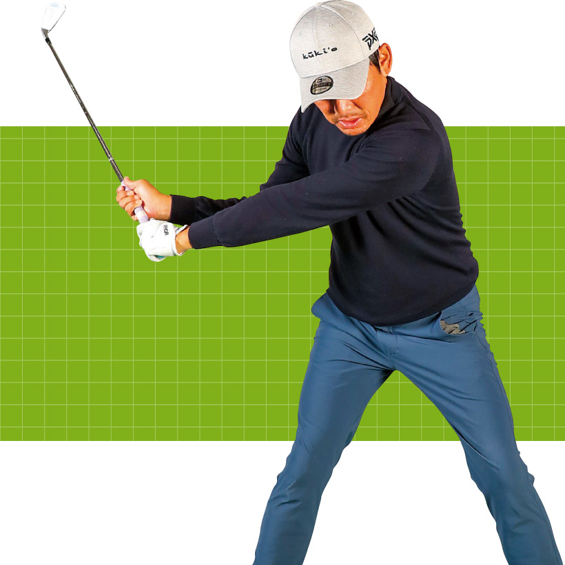 ただしハンマーで釘を打つ準備動作をするのと同様、右手首でクラブを引き上げる感じでコックを入れます。そう見えないのは右手を下から握っているから。上から握らない分アドレスの時点である程度コックされているのです。左ヒジが伸びっぱなしなのもコックしている証。手首を使わない人はヒジを曲げないとクラブが上がりません。