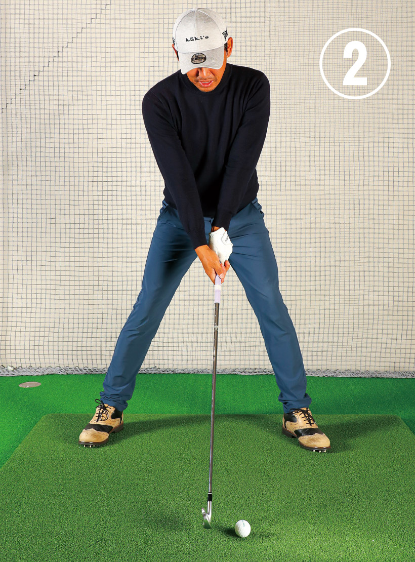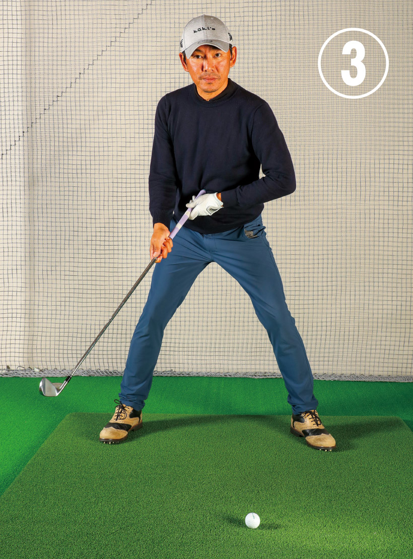 ②両腕を伸ばしワキも空けてOK。インパクトのイメージで構える。