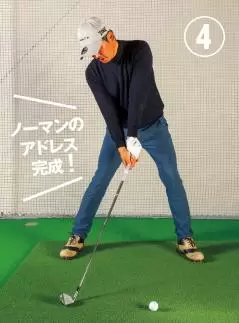 腕を伸ばし、右足を広げて立ったら上体を右傾させつつヘソを左に向ける。スタンスはややクローズド。ボール位置は左カカト延長線上。