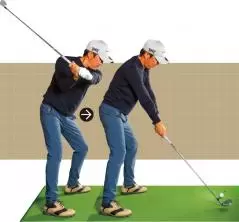 右手のコックを使うと左腕は伸ばしたままバックスイングできる。コックを控えた場合、左ヒジを曲げないとクラブが上がらない。
