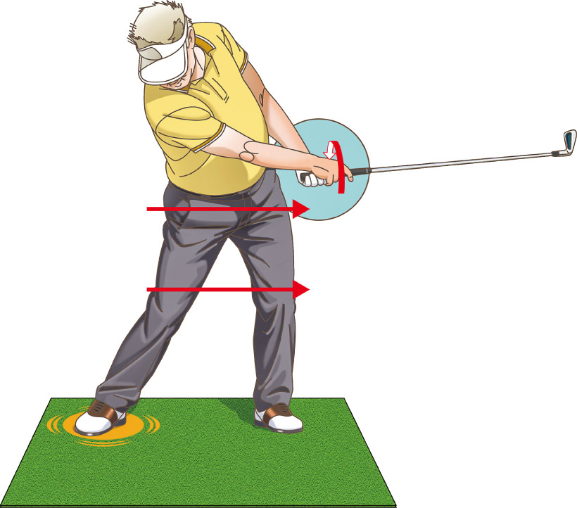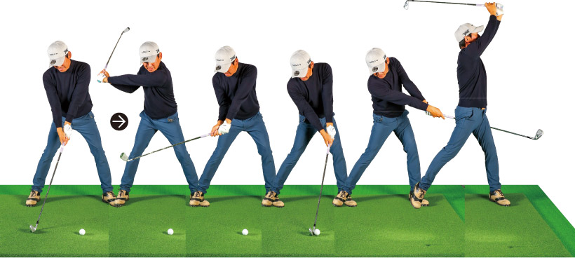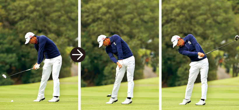 ダウンスイングでは体の回転を意識せず右から左へ腰を平行移動。それでも体は勝手に回ってインパクトゾーンが長くなる。