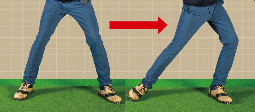 ダウンスイングでは体重が右から左へ大きく移動。腰が平行移動しているので、右足の外側がまず地面から離れる。右カカトが上がるのは打ったあとだけ。