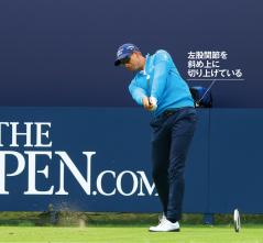 左ヒザを伸ばすことで左腰の回転がうながされ、左股関節が切れ上がる。振り下ろす右こぶし(クラブ)には、下向きの加速度が働く。