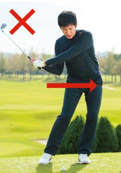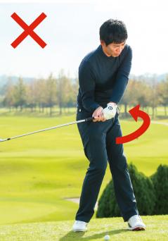 体のヨコ回転イメージが強すぎると、シャフトが寝た状態になり、振り遅れる。体をタテに動かすことで、クラブもタテに動きやすくなり、より直線的な軌道でインパクトしやすくなる。