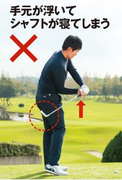 ダウンスイングでは、手元を下げながら回転しないと、シャフトが寝て振り遅れ状態になり、フェースが開いてインパクトを迎えてしまう。