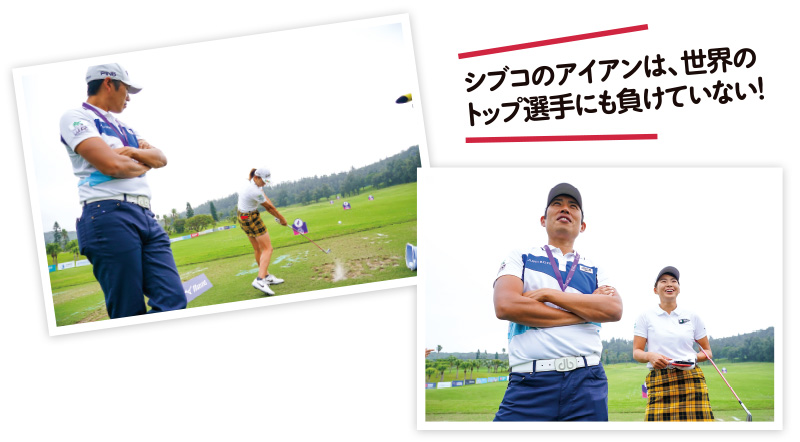 「これはシャフトのしなりを生かして打つことをマスターするための練習です。元々、シブコはアイアンでも硬めのスチールシャフトを使っていたので、しなりが使えていなかったんです。この超軟らかシャフトで上手くボールが打てるようになれば、本番のシャフトでもしなりを使ってインパクトできます。インパクトの瞬間にはシャフトがしなってヘッドが前にある“Cの字”になっていることが大切です。このシャフトの練習は、アマチュアの皆さんには、めちゃめちゃオススメですよ!」