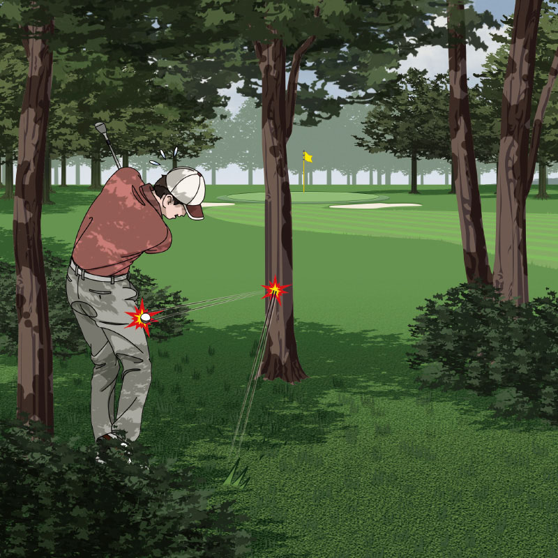 林の中で、打球が木に跳ね返ってプレーヤー自身の体に当たってしまう、という事故は結構ある。