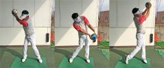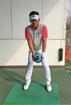 まず、ボールを両手で挟んで体の正面に持ち、いつものスイングのようにバックスイングしてフォローまでの動きを繰り返します。ポイントは、できるだけボールを体から遠くに離すように意識すること。
