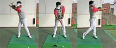 目指すのは、このような大きなスイングアークのスイング。バックスイングでは左腕が、フォロースルーでは両腕がビシッと伸びている点に注目してください。自然と体全体を使うスイングになるため、大きなパワーが生まれ、大きな飛距離を期待できます。