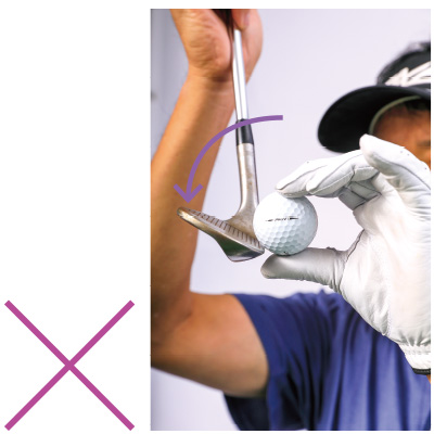 そうじゃなく、まずフェースを被せて歯の部分を地面に着ける、これで歯が浮かないでしょ。そうしたら、このフェースを今度は開きながらボールの周囲をクルっと回転させるんですよ。
