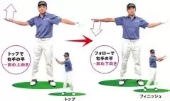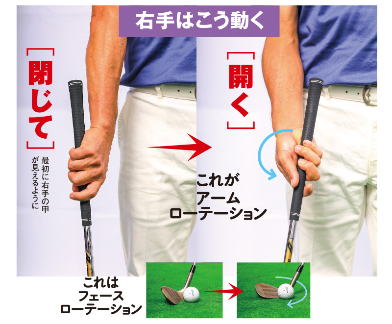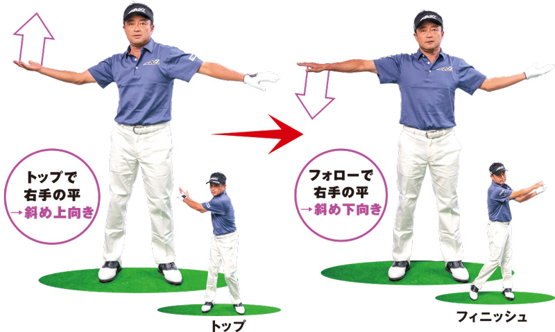 つまり、トップで右手の平が上を向いていたものが、フィニッシュでは右手の平は下を向く。