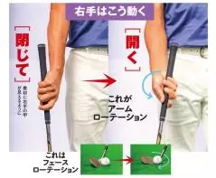 この、右手のヒラの向きを180度回転させるのが腕の回旋運動です。この腕の回旋運動に、体のターンである回転運動を加えるとスイングになるわけです。アマチュアの人は、この腕の回旋運動が上手くできないので、様々なミスが出たり、飛距離がでなかったりします。