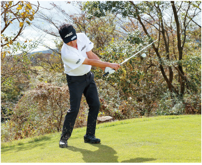 インパクト直前から、ヒジを自分の体の方に引き寄せることで、ヘッドをボールに対して90度に当て、フワッとした弾道になる。