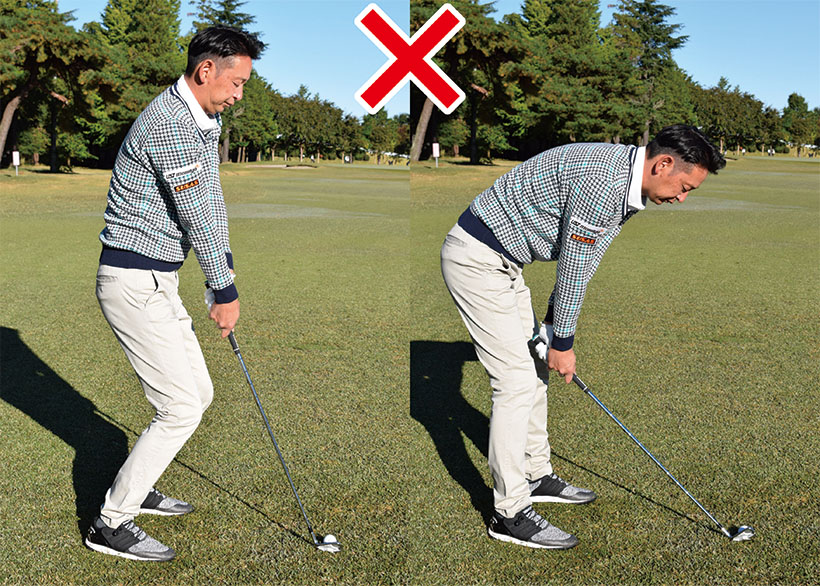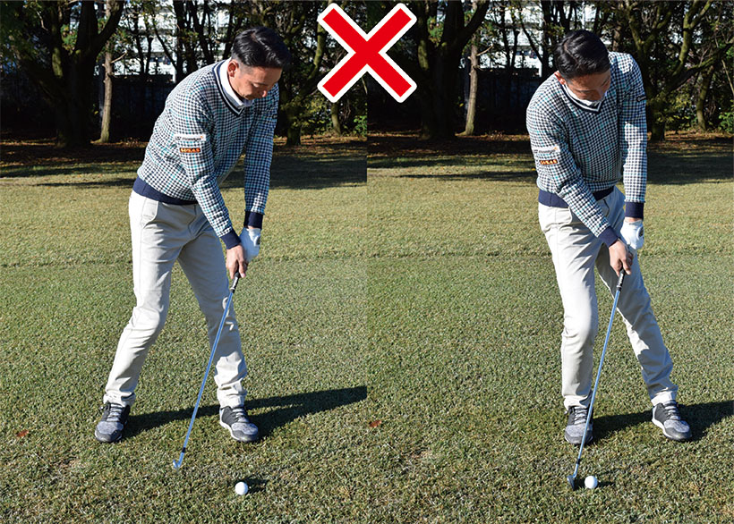 ボールと体の間隔が適切でないと正しいインパクトが作れず、ダフリやトップなど様々なミスショットを誘発します。また体重配分が偏っては体の軸が傾いて、正しい軌道で振れません。