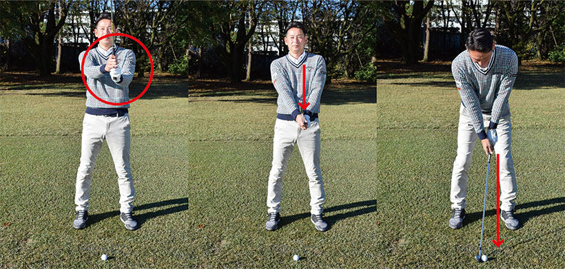 - 次にクラブをゆっくり下ろす。すると両腕やクラブがこれ以上は下がらないポイントが必ずある。両手がお腹の高さくらいに下りたところが目安