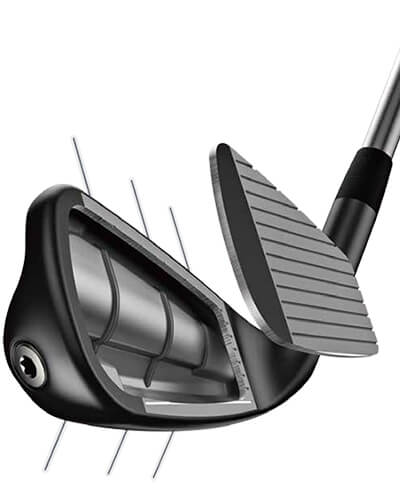一つ目は、慣性モーメントの拡大。中空構造のメリットを生かし、トゥ側のウェイトの重量増とヘッド内部設計の見直しで、ピンのアイアン史上最大の慣性モーメントを達成している。さらに、フェースの裏側のポリマー素材とバックフェース側内部3本のリブを持たせることで、不要な振動を抑えて打感と打音を向上させている。ヘッドの慣性モーメントを高めることでミスヒットに対する高い許容性で、7番アイアンで28度のストロング設計ながら、安定した飛距離と方向性が得られるヘッドに仕上げられている。