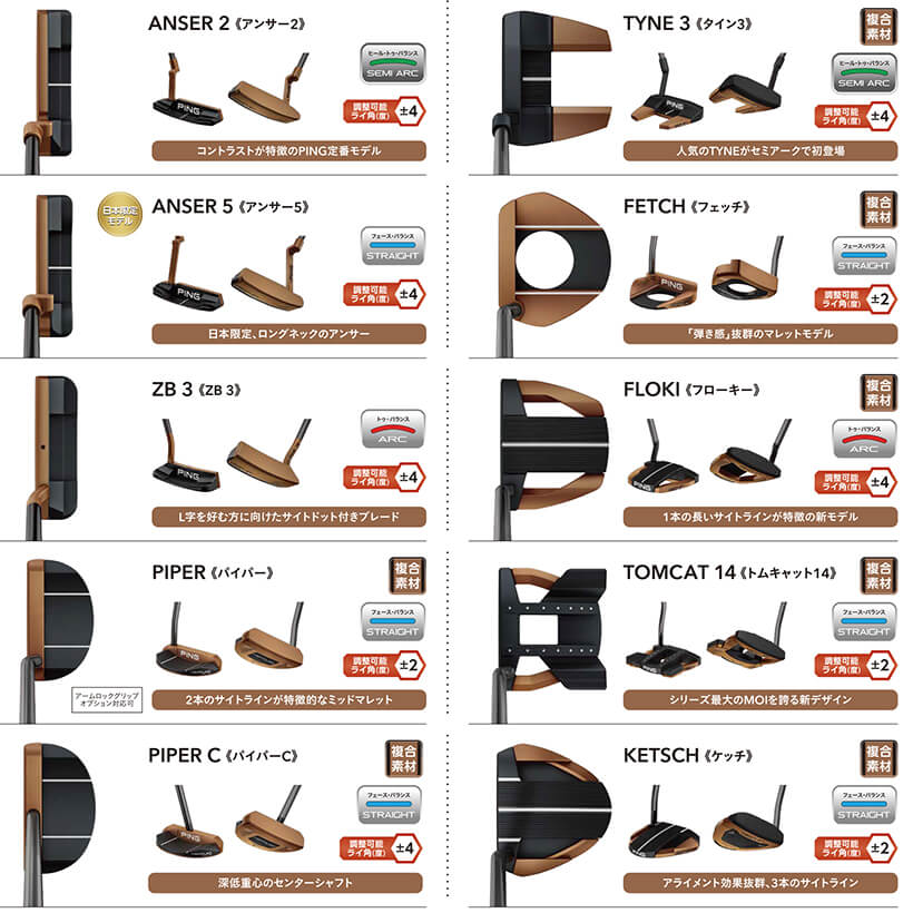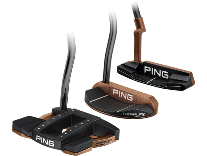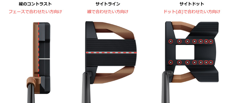 さらに、高いアライメント性能もヘプラーシリーズの特徴。全10モデルがラインナップされているが、すべてのモデルがカッパーとブラックのツートンに仕上げられ、さらにモデル形状に応じて異なるサイトラインとサイトドットが施されている。ブレードタイプは、カッパーとブラックのコントラストでアライメントを追求。大型マレットは素材色のコントラストとサイトラインとサイトドットのパターンを変え、ヘッドタイプ毎にマッチするストロークタイプに合わせたパターンが採用されている。