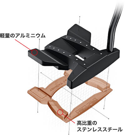 ヘプラーシリーズは、ステンレスとアルミの複合構造で、ソリッドな打感と球の弾きを追求している。しかしそれだけなら、TR溝を排除する理由にはならない。この複合構造とヘッドデザインで、TR溝を用いなくても同等の機能が得られ、さらに、伸びのある球のコロガリと“弾き”を感じる打感が得られるということのようだ。比重の重いステンレスをヘッドの外周に用い、比重の軽いアルミをヘッドの中心部に用いる複合構造とすることで、慣性モーメントを高め、ミスヒット時にも安定した球のコロガリが得られる設計が採用されている。慣性モーメントを拡大してミスヒット時にも安定した球のコロガリが得られるというのはピンが初めて世に送り出した「1Aパター」から一貫した設計。その最新作もまた、慣性モーメントの拡大で安定したコロガリを追求したということだ。