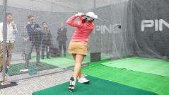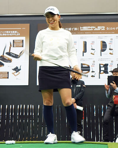 その後、全英女子オープンの最終ホールのグリーンを再現したという人工芝のグリーンで、その気になったモデルを試打。鈴木プロは「カッパーとブラックの2色使いですごく構えやすいし、硬めの打感ですが、フェースにくっつく感じも得られるので、狙いやすい」とコメント。